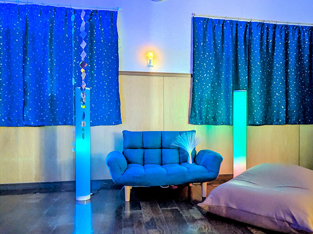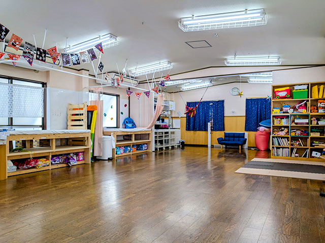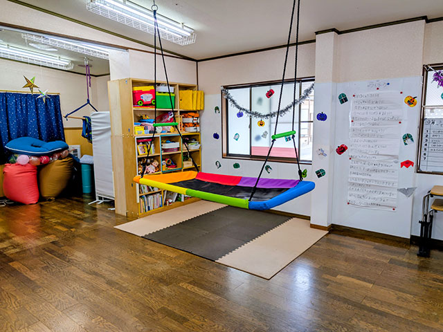 小学1年生~高校3年生の医療的ケア児・重症心身障害児を対象に、看護師が複数人いる安全安心な環境の中、お友達との関わりや理論に基づいた療育を行うことで、余暇の充実と成長発達を支援しています。感覚統合療法、スヌーズレン療法、リトミックなどの室内活動や、公園、外出行事などの戸外活動などの集団活動を通して、自発的な身体の動きや気持ちの発信を大切にしています。PT監修のもとリハビリやストレッチ、入浴支援など1人1人に合った個別支援も行っています。