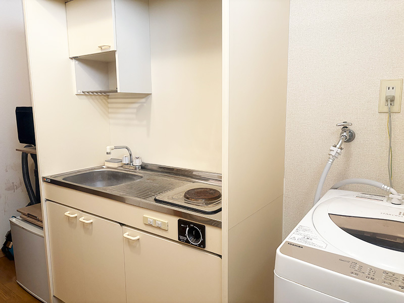 流しはありますが、ガス調理はできません。電気調理器は使用できますので食事提供のない日は自炊できます。